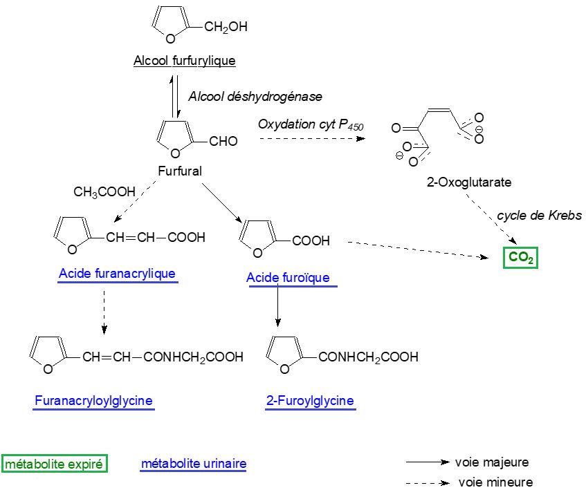 Les voies de biotransformation de l’alcool furfurylique sont relativement bien connues chez le rat (voir fig. 1). La voie majeure, après administration orale, est une oxydation en furfural, puis en acide furoïque qui est conjugué avec la glycine et éliminé. Une voie mineure mène à l’acide funacrylique qui est également éliminé sous forme de conjugué avec la glycine. Une excrétion de CO2 dans l’air expiré a été montrée chez le rat et la souris. La formation de CO2 nécessite soit l’ouverture de la molécule en 2-oxo-glutarate qui, par l’intermédiaire du cycle de Krebs, est dégradé en CO2, soit une décarboxylation de l’acide furoïque.
