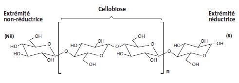 La cellulose est un polysaccharide de la série des β-D-glucanes. Son motif répétitif est le cellobiose [figure 1] : il est constitué de deux β-D-glucopyranoses (glucoses) dans leur conformation chaise 4C1 unies par une liaison glycosidique β1-4 [1].