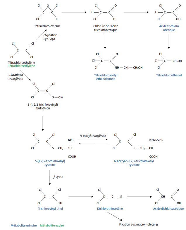 La voie oxydative (enzymes à cytochrome P450) est une voie prépondérante mais saturable : l'excrétion d'acide trichloroacétique (TCA) atteint un plateau à forte dose, alors que les excrétions de N-acétyl-S-trichlorovinyl cystéine (TCVC) dans l'urine et de tétrachloroéthylène dans l'air expiré augmentent à forte dose.