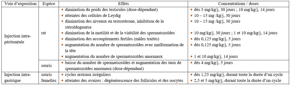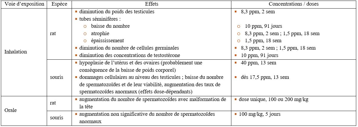 Quelques études ont mis en évidence une diminution des concentrations sériques de testostérone suite à une exposition par inhalation (souris mâles et rats) et par injection (rats mâles), mécanisme potentiellement impliqué dans les effets sur l’appareil reproducteur masculin. Une atteinte via l’axe hypothalamo-hypophyso-surrénalien est également envisagée.