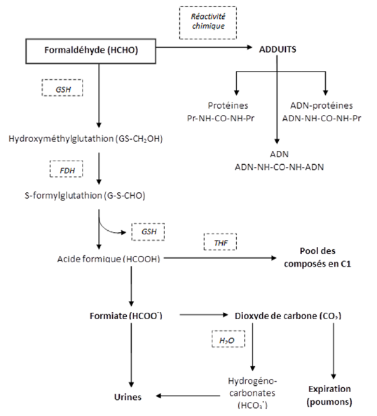 Dès le site de contact, il est rapidement métabolisé en formiate puis en dioxyde de carbone par divers systèmes enzymatiques largement distribués et nécessitant notamment la présence de glutathion (Cf schéma métabolique). L'aldéhyde formique réagit rapidement avec le glutathion (GSH) pour former dans une première étape l’hydroxyméthylglutathion, ultérieurement oxydé par l'aldéhyde formique déshydrogénase (FDH) en S-formylglutathion. L’hydrolyse de ce composé libère du glutathion et un ion formiate (HCOO-), soit excrété dans les urines, soit oxydé en CO2 éliminé surtout au niveau pulmonaire ou intégré dans le pool des composés en C1 via la voie dépendante du tétrahydrofolate [19, 27].