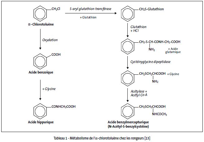 Après absorption, l'α-chlorotoluène est métabolisé par oxydation et/ou conjugaison et excrété principalement sous forme d'acide benzylmercapturique urinaire.