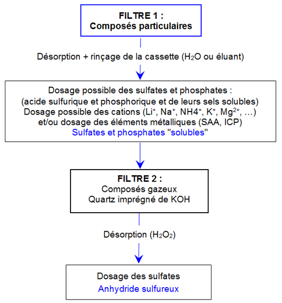 Les particules éventuellement présentes dans l’aérosol sont collectées sur un premier filtre (en général une membrane de faible porosité) et l’anhydride sulfureux gazeux est recueilli sur le second filtre imprégné d’hydroxyde de potassium. À la désorption, l’anhydride sulfureux est oxydé en sulfates qui sont alors dosés par chromatographie ionique ou électrophorèse capillaire.