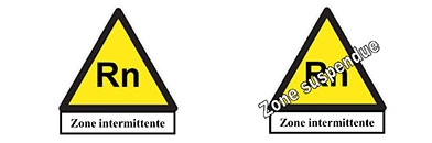 La zone radon est nécessairement délimitée par les parois du lieu ou du local de travail concerné. Elle doit être signalée à l’aide du pictogramme ci-dessous.