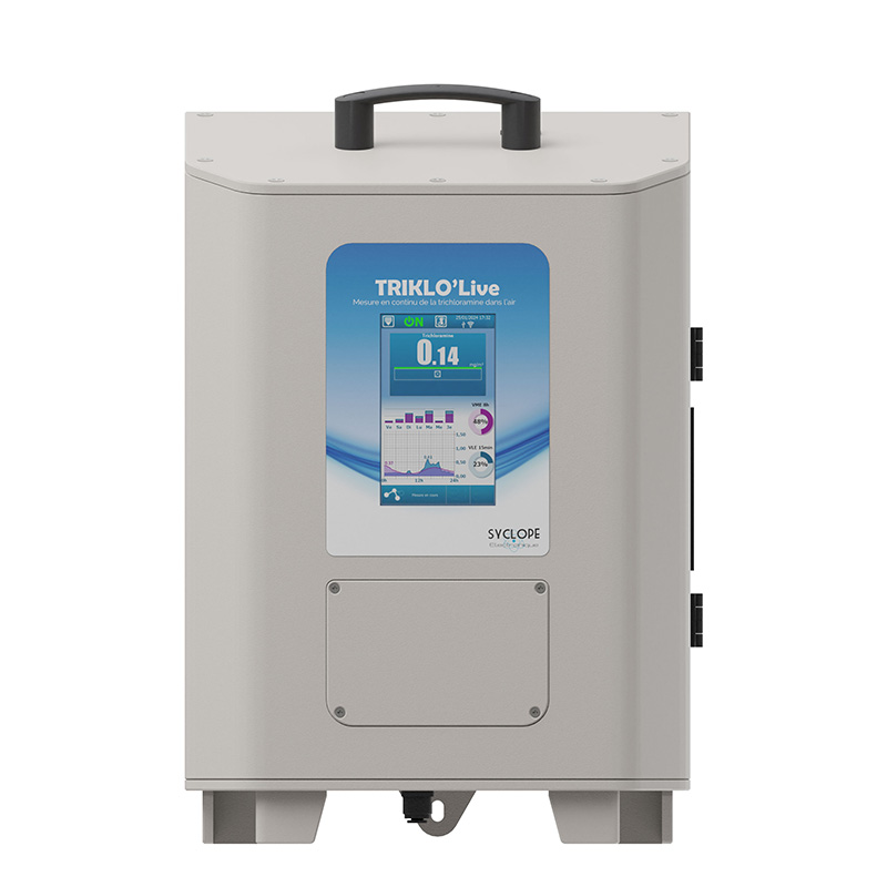 Cet équipement peut être déplacé vers les zones où des mesures sont souhaitées, ce qui en fait un outil très utile pour identifier les zones et activités à risque. Il fonctionne de manière autonome, sans intervention humaine requise. Un écran tactile affiche en temps réel la concentration de trichloramine dans l'air en mg/m³ au point de mesure. Triklo’live permet également d’afficher les moyennes de concentration sur un temps défini pour pouvoir se comparer aux données équivalentes à une VLEP-8h (valeur limite d’exposition professionnelle sur 8 heures) ou à une VLCT (valeur limite à court terme sur 15 minutes). Les études menées par l’INRS ont montré qu’à partir de 0,5 mg/m3 sur la durée d’un poste de travail et 1,5 mg/m3 sur 15 minutes, la trichloramine devient gênante pour les salariés (valeur dite d’inconfort) (source : données de validation fiche METROPOL). Pour prévenir les risques, l’Agence nationale de sécurité sanitaire de l’alimentation, de l’environnement et du travail (Anses) recommande une valeur limite d’exposition à la trichloramine dans l’air inférieure à 0,3 mg/m³.